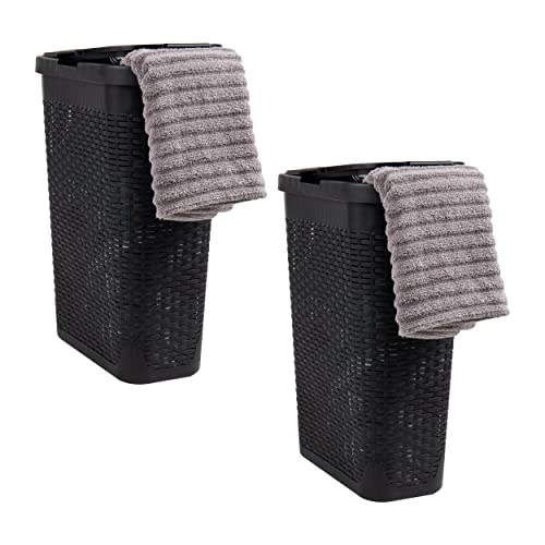 Mind Reader 40L Slim Laundry Hamper, Clothes Basket, Lid, Wicker Design, Plastic, 18"L x 10.4"W x 23.5"H, Set of 2, Black