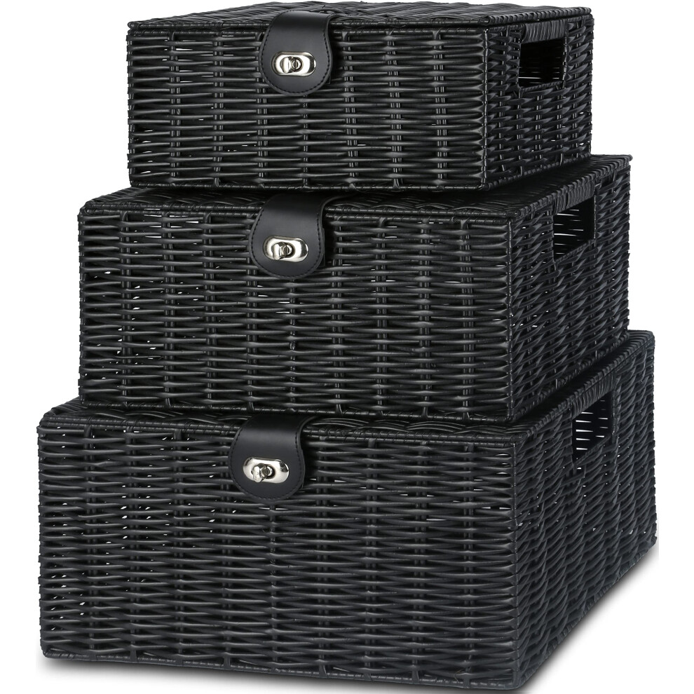 Honygebia Black Wicker Storage Baskets - Set of 3 Decorative Nesting Boxes with Lids Woven Basket with Lock & Handle Organizer for Beauty Makeup Bat