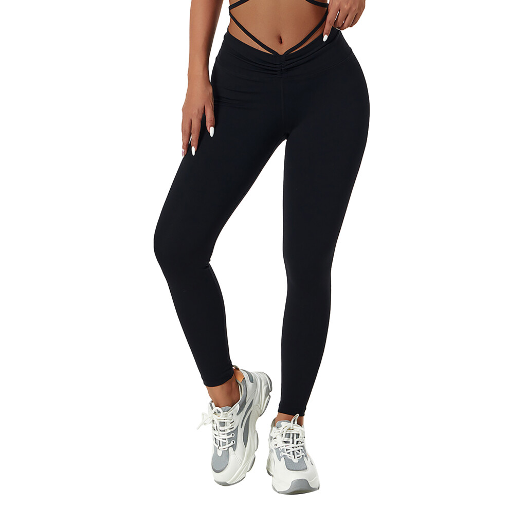 (Black, S) Women Yoga Pants Cross Waist Leggings Butt Lifting Tummy Control Gym Tights