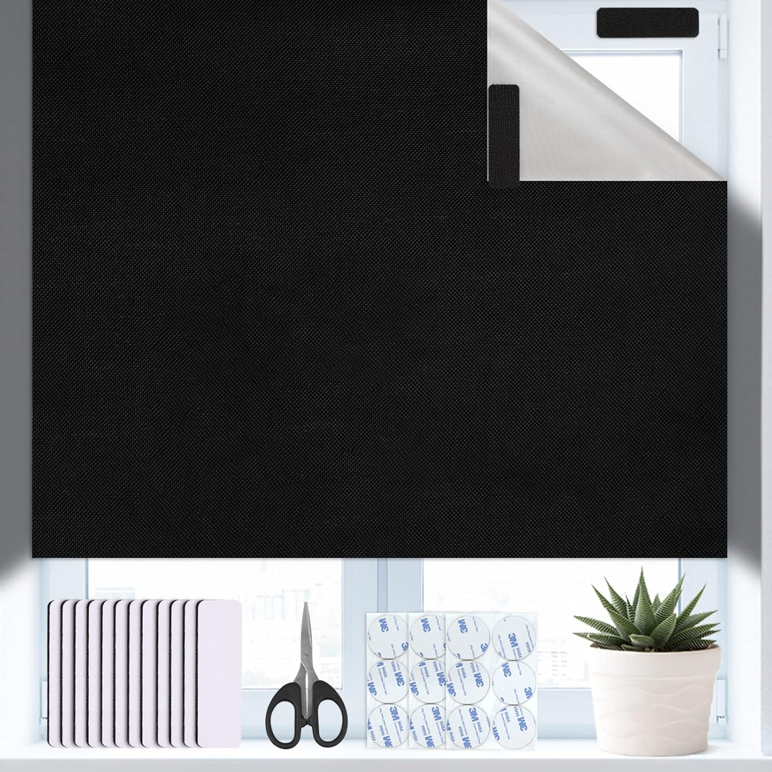 Blackout Blinds Stick On, 100% Blackout Blind Curtain for Window, 420D Fabric Portable Blackout Shades Film for Bedroom, Cut to Any Size, 18*Round adhesive & 12 Loop Tapes