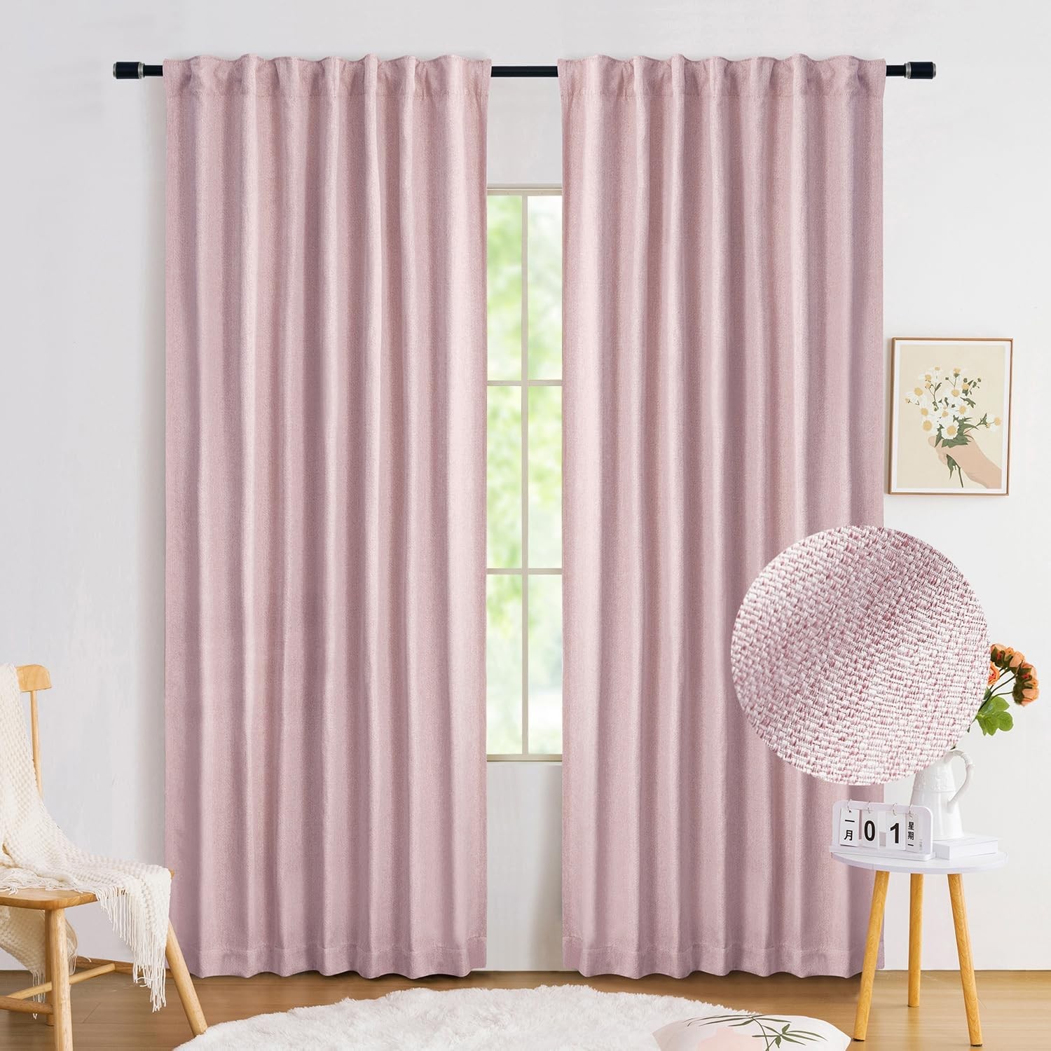 Pink Full Blackout Curtains for Nursery Girls Bedroom, 54 Inches Long Burlap Li