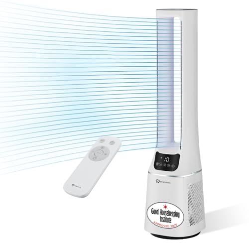 PureMate 2-in-1 Bladeless Tower Fan & air purifier with HEPA Filter, 10 Speed Settings, Portable Ultra Quiet Standing Fan with Remote Control, Digital Display, Powerful Air Cooling for home & office