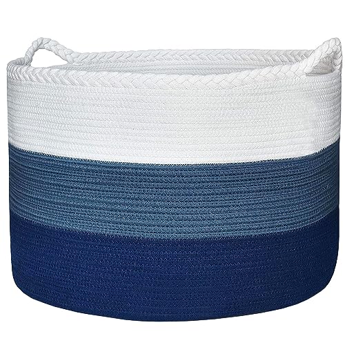 Casaphoria Stuffed Animal Storage, Woven Storage Basket, Laundry Hamper,Laundry Basket, 21.7*21.7*13.8in Clothes Basket, Cotton Rope Basket, Blanket Basket Living Room (White&Cadet Blue& Navy Blue)