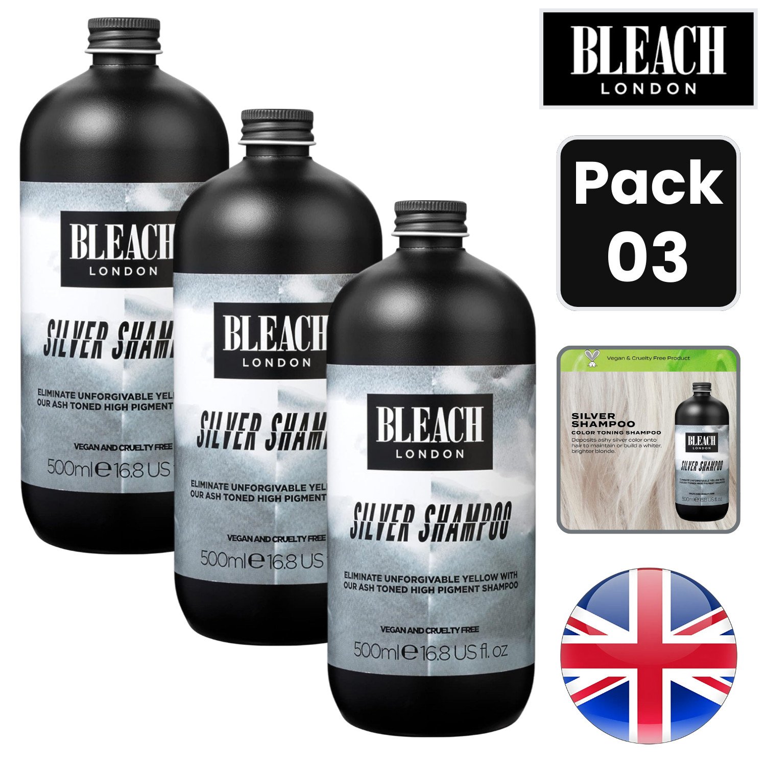 Bleach London Silver Shampoo Neutralises Yellow Tones 500ml - Pack of 3
