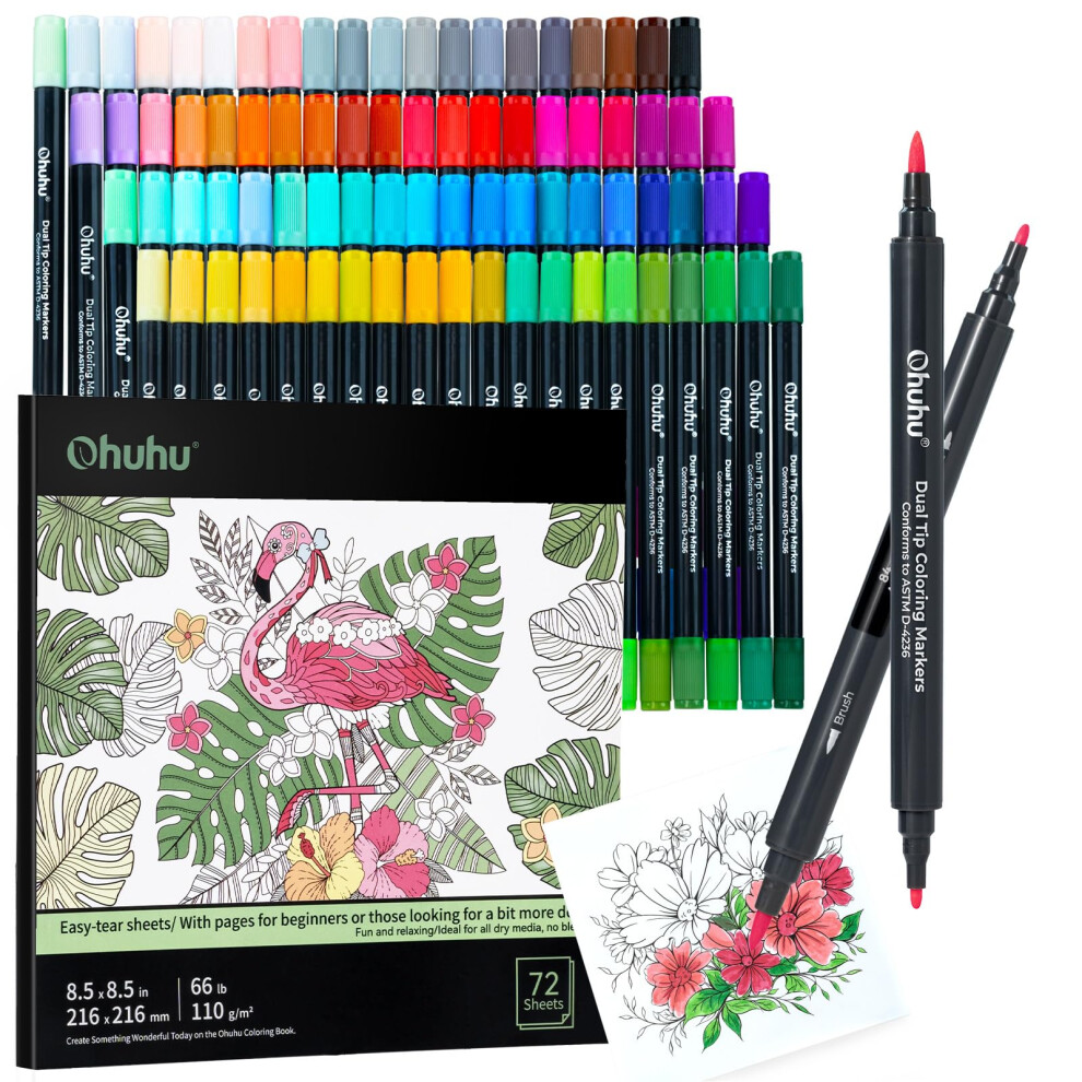 Ohuhu Markers 80 Colours with 72 Pages Colouring Books - Dual Tip Markers for Adults Colouring Books - Art Marker Set Bundles with 100% Bleed-Proof