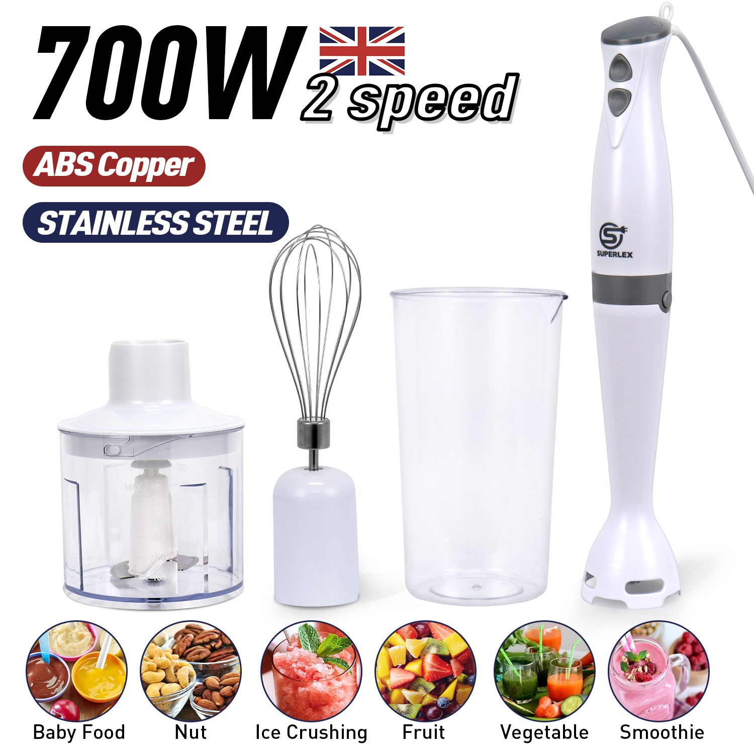 SUPERLEX 4 in 1 Hand Blender Set Food Processor Mixer Whisk & Chopper Bowl Jug