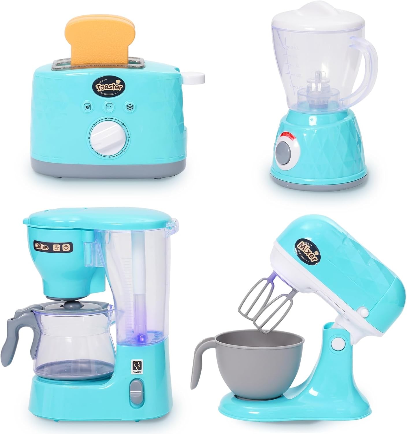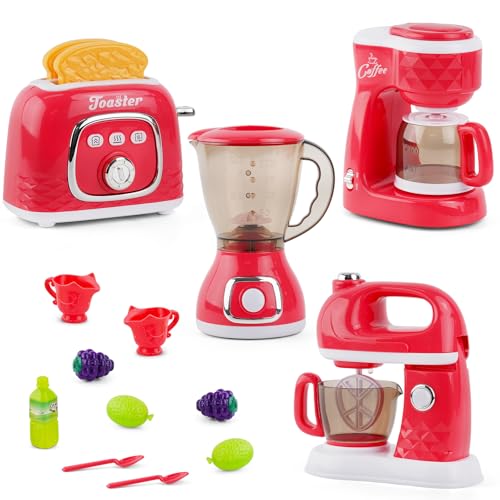 Pretend Play Kitchen Appliances Toy Set with Coffee Maker Machine,Blender, Mixer and Toaster with Realistic Light and Sounds for Kids Ages 3+