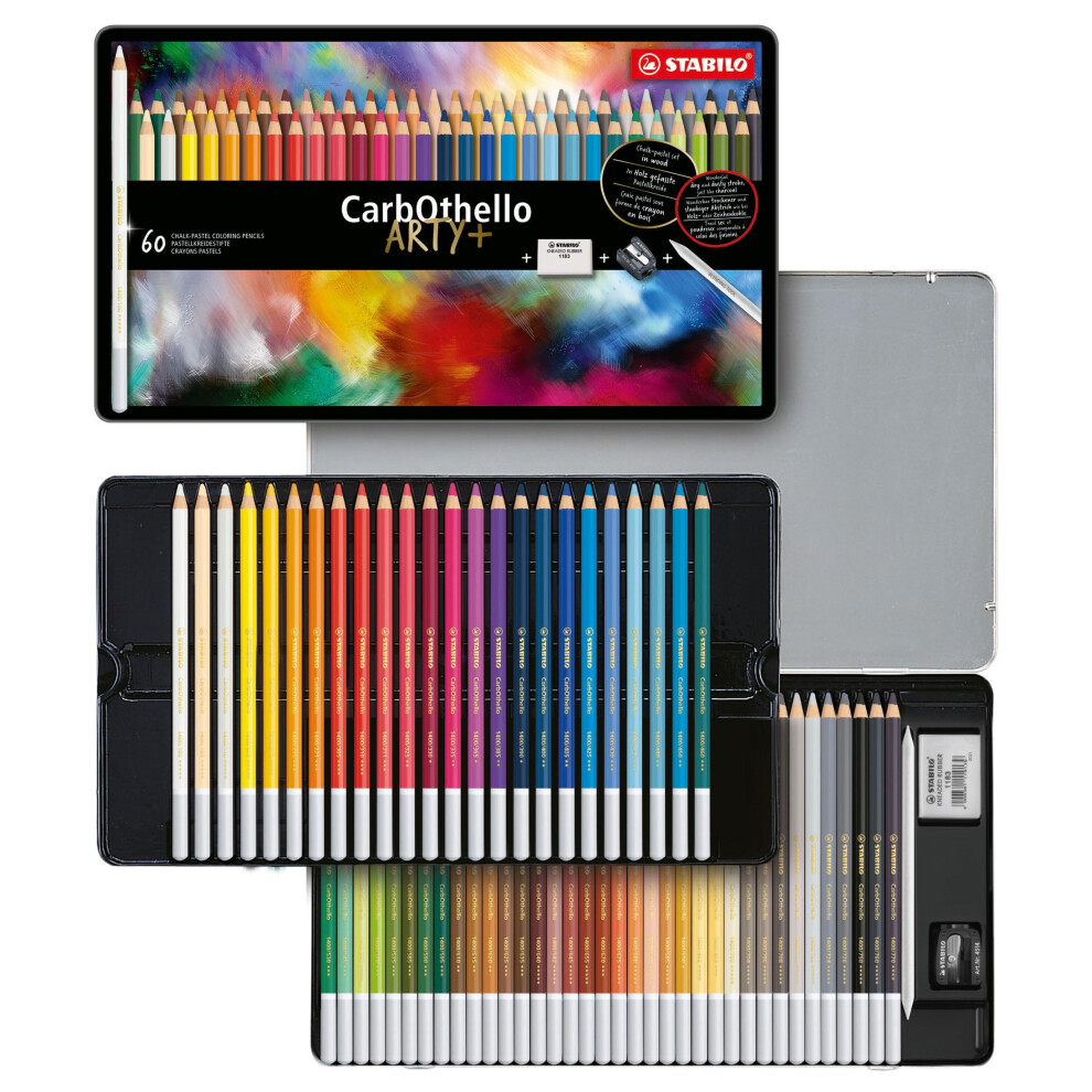 STABILO CarbOthello - Chalk-Pastel Pencil - ARTY+ - Tin of 60 - Assorted Colours with Sharpener, Kneaded Eraser and Blending Stump