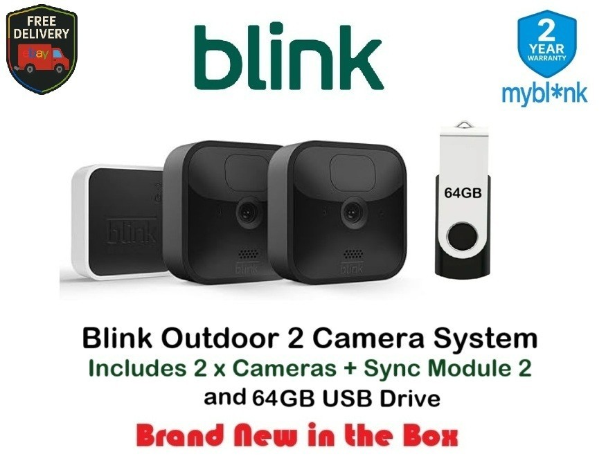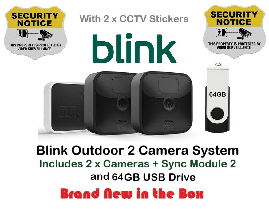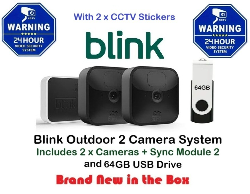Blink Wireless HD Smart Security 2 Camera Gen3 System + 64GB USB + CCTV Stickers