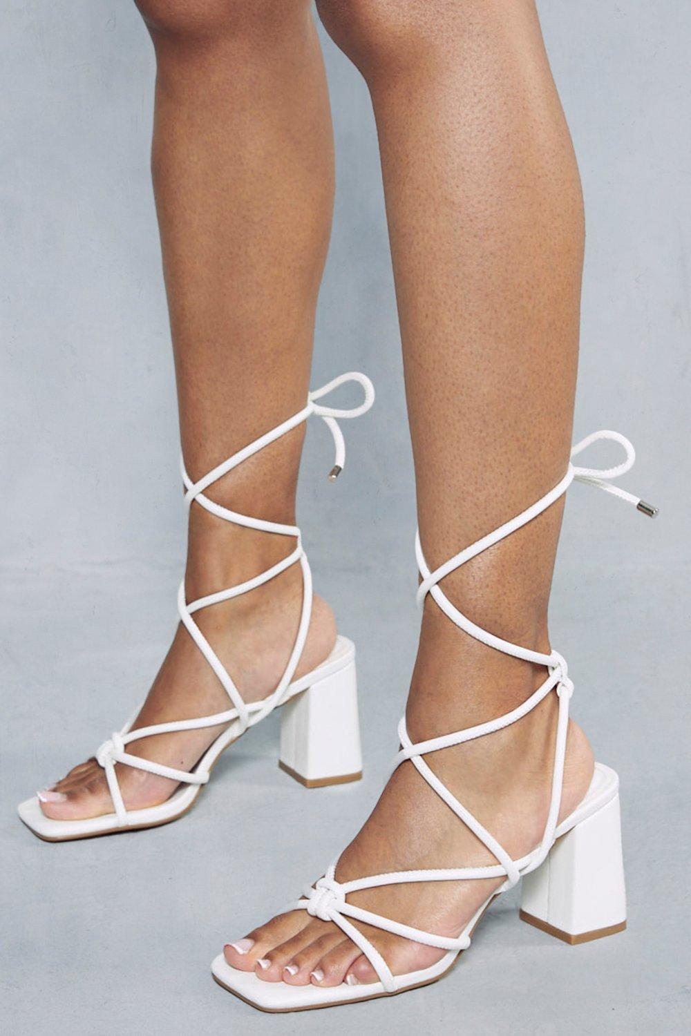 Womens Strappy Sandals Ladies Low Mid Block Heel Ankle Strap Square Toe Shoes Size 3-8 White Synthetic Leather