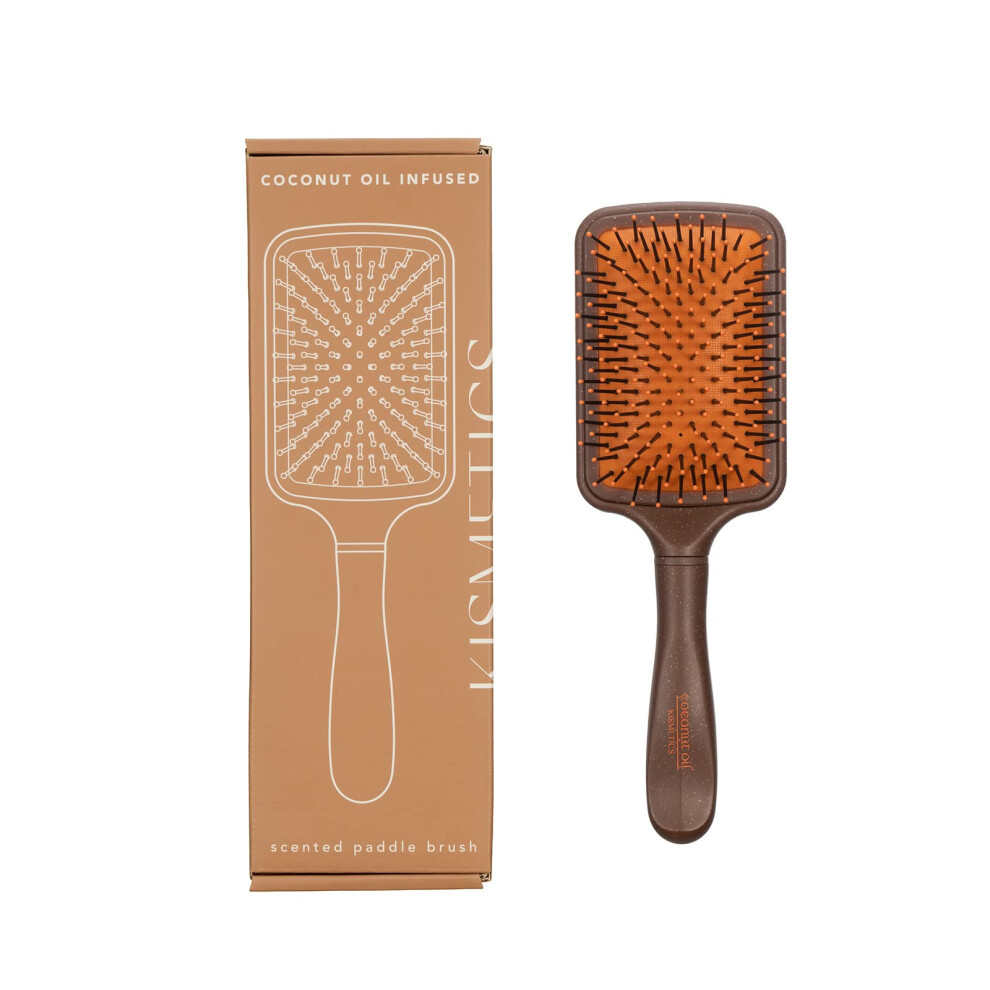 KISMETICS Coconut Oil Infused HAIR BRUSH, Scented Paddle Brush, for Gentle Detangling, Scalp Massage or Blow-dry. For All Hair Types. Brown