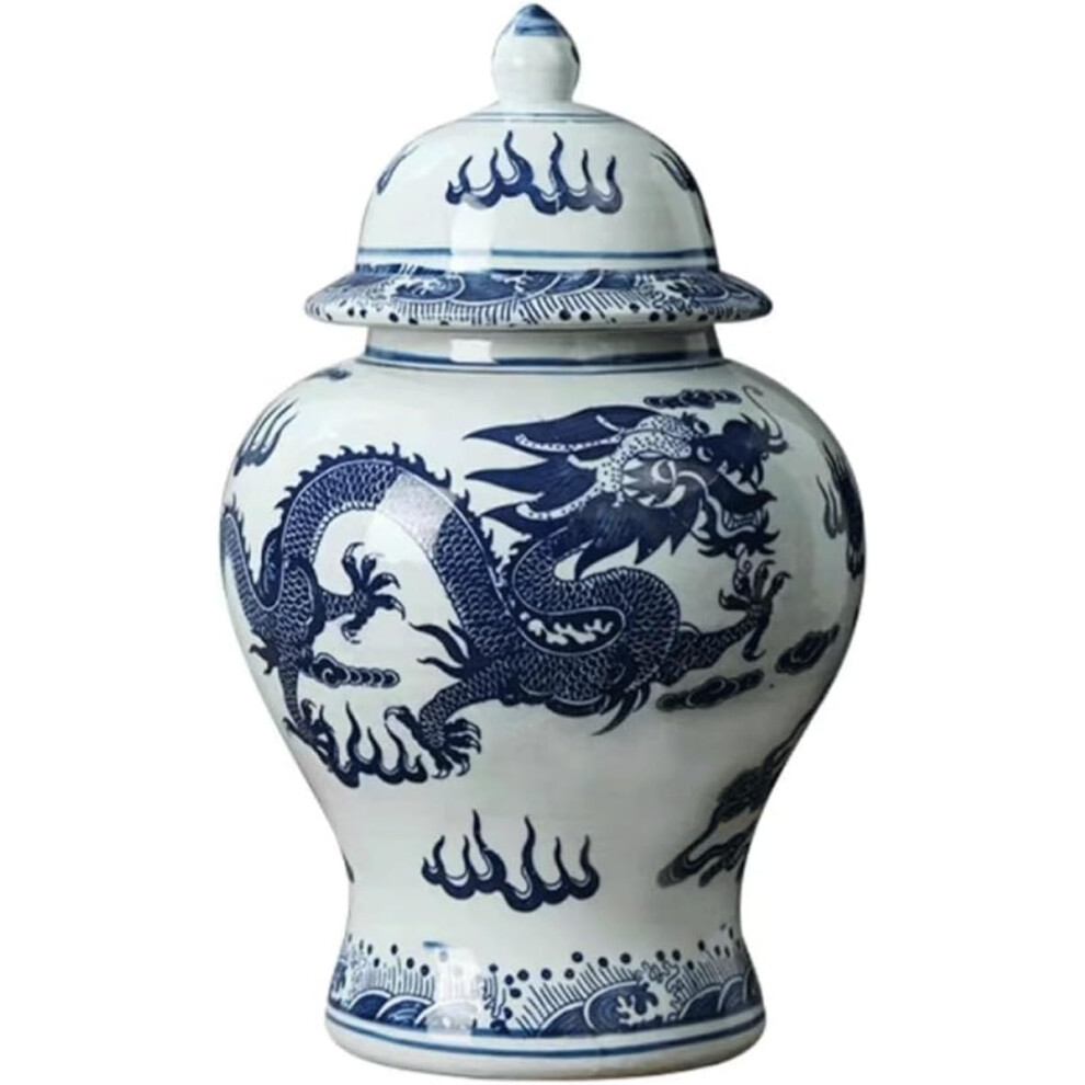 Chinese Porcelain Ginger Jar with Lid, Hand Painted Blue and White Dragon Vase, Jingdezhen 31x18cm