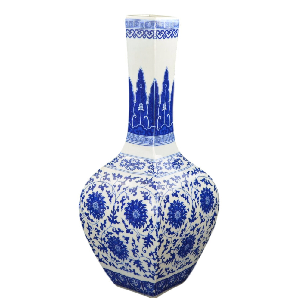 14"" Classic Blue and White Floral Porcelain Vase Square Globular Sha