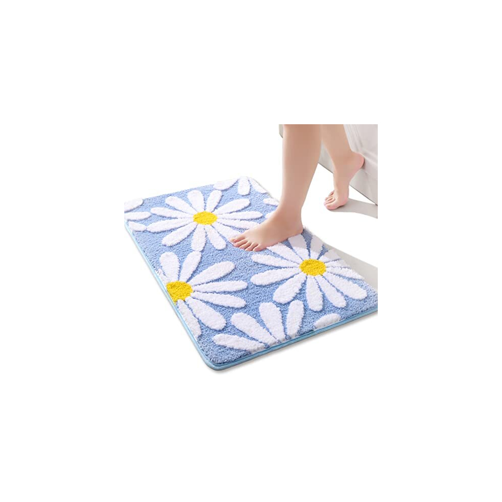 Blue Bath Mat White Flower Rug 40 x 60 cm, Non Slip Bath Mats for Bathroom, Soft Microfiber Bathroom Mat, Machine Washable Rug Durable Bathmat, Super