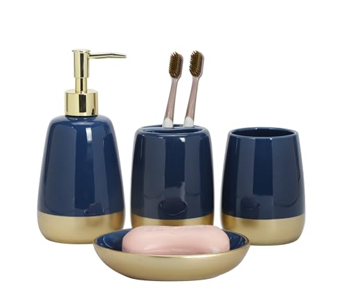 Navy Blue Gold Luxury Bathroom Accessories Set 4 Pieces,Vanity Countertop Ceramic Accessory Set for Bathroom Decor with Soap Dispenser,Toothbrush Holder, Tumbler,Soap Dish (Navy Blue)