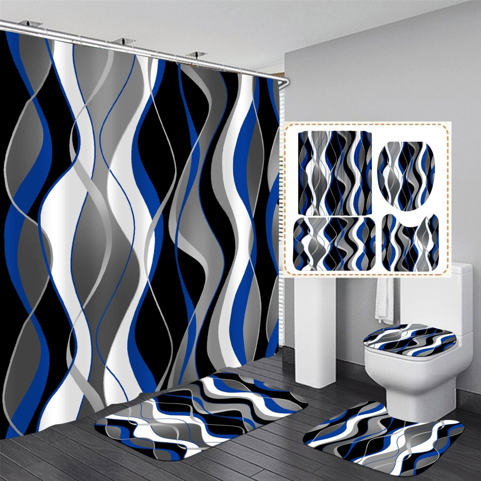 4 Piece Blue and Black Bathroom Accessories Set with Shower Curtain, Non Slip Rugs and Lid Cover