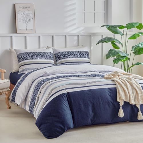 Aisbo Double Duvet Cover Set Navy Blue Seersucker Bedding Set with 2 Pillowcases, Soft Breathable Textured Puckering Bed Quilt Cover Set with Zipper (200×200cm) 3pcs