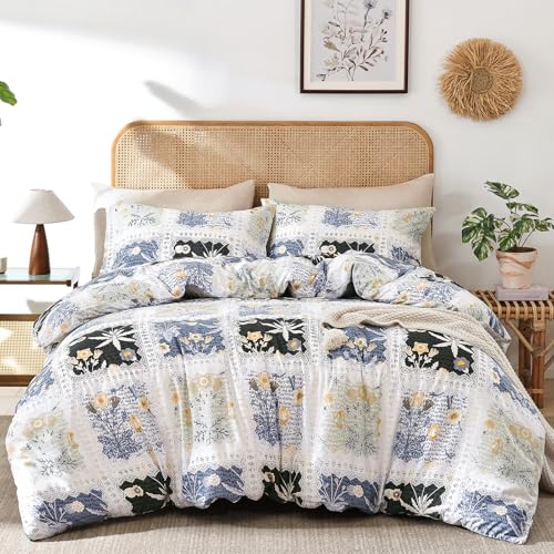 mixinni Vintage Style Garden Flower Duvet Cover Set with Zipper Closure Long Staple Percale Cotton Yellow Vibrant Pattern on Blue Bedding Quilt Cover Set(King, All Season)