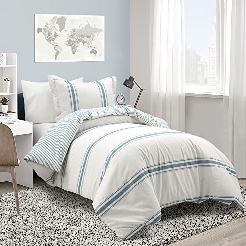 Lush Decor Farmhouse Stripe Reversible Cotton Duvet Cover Set, 2 Piece Set, Twin XL, Blue - Twin Bedding Set - Dorm Decor - Striped Duvet Cover For Kids Or Teens - Farmhouse Bedroom Decor