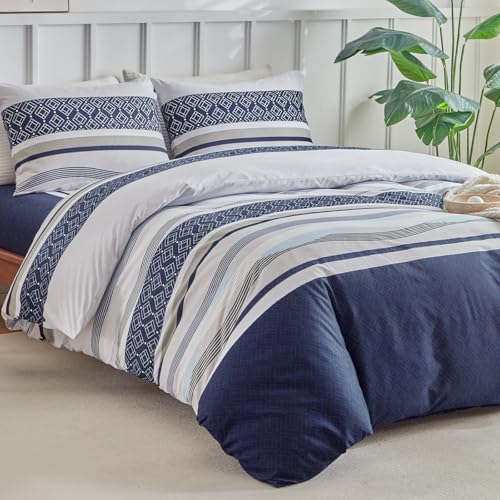 Aisbo King Size Duvet Cover Sets Navy Blue Seersucker Bedding Set with 2 Pillowcases, Soft Breathable Textured Puckering Bed Quilt Cover Set with Zipper (230×220cm) 3pcs