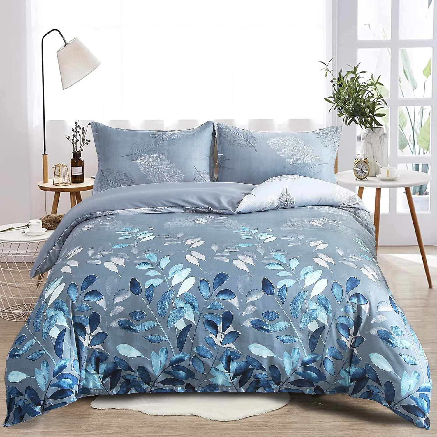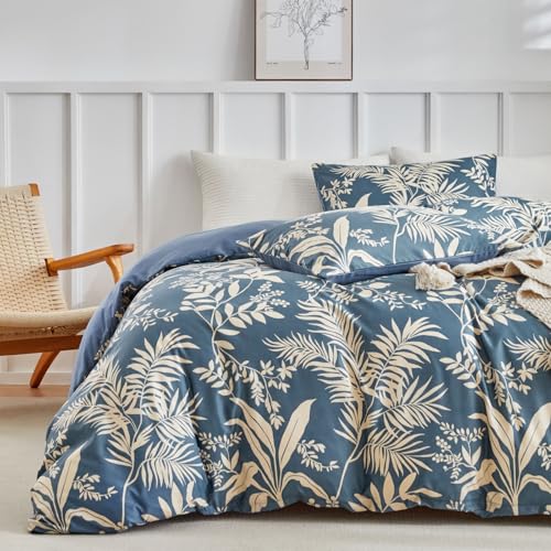 Floral Duvet Cover Double Blue Leaves Bedding Set, Reversible Lightweight Sets