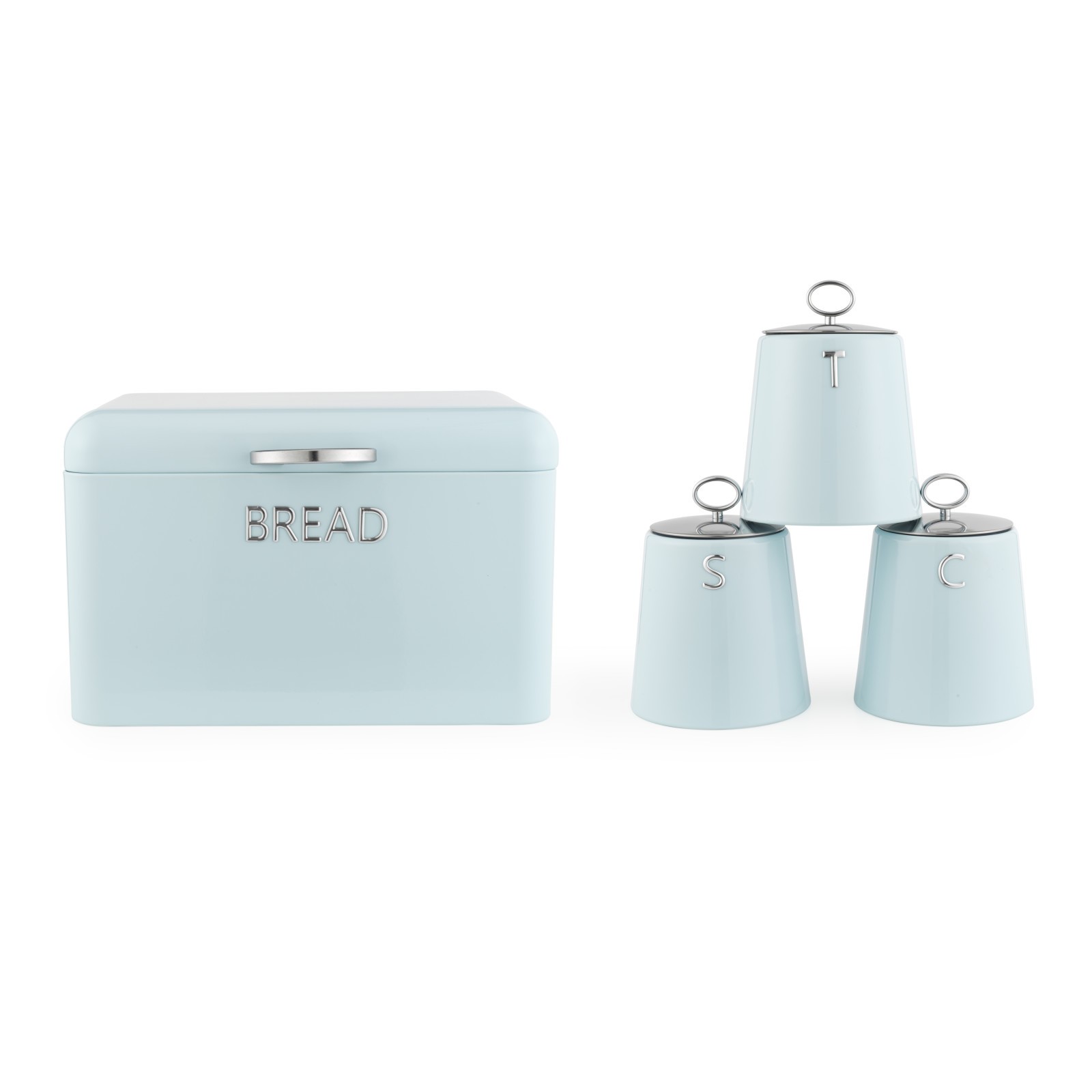 Salter Retro Blue 4Pc Countertop Set – Bread Bin, T, C & S, Embossed Lettering