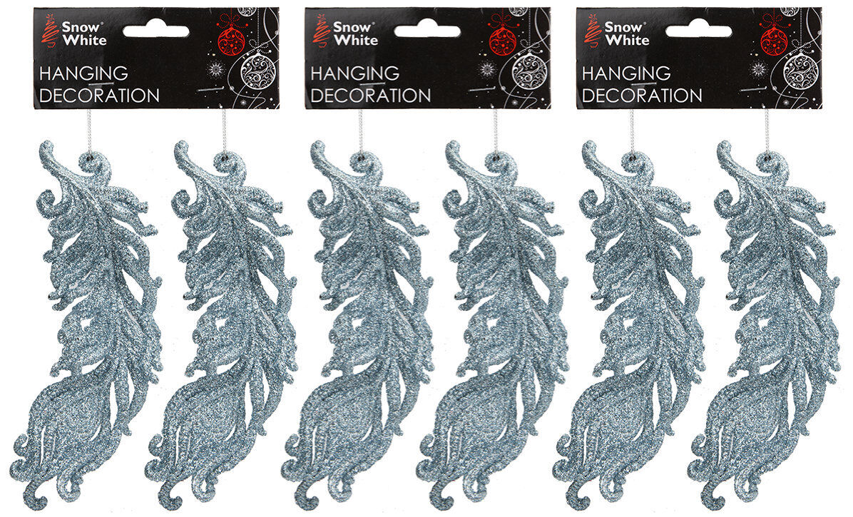 Blue Feather Christmas Baubles Hanging Decorations Tree Decor - Set of 6