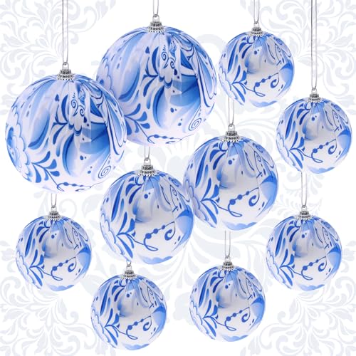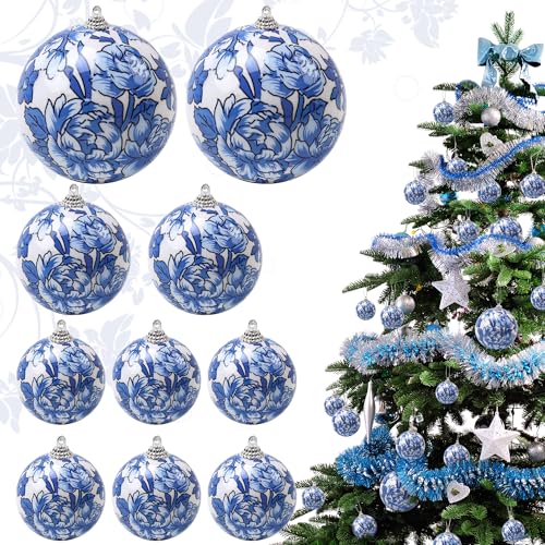 Yatinkim 10 Pcs Blue Christmas Bauble Blue and White Christmas Baubles Decorations Chinoiserie Bauble Decoration Ceramic Style Plastic Hanging Balls for Xmas Tree Decorations Home Party Holiday