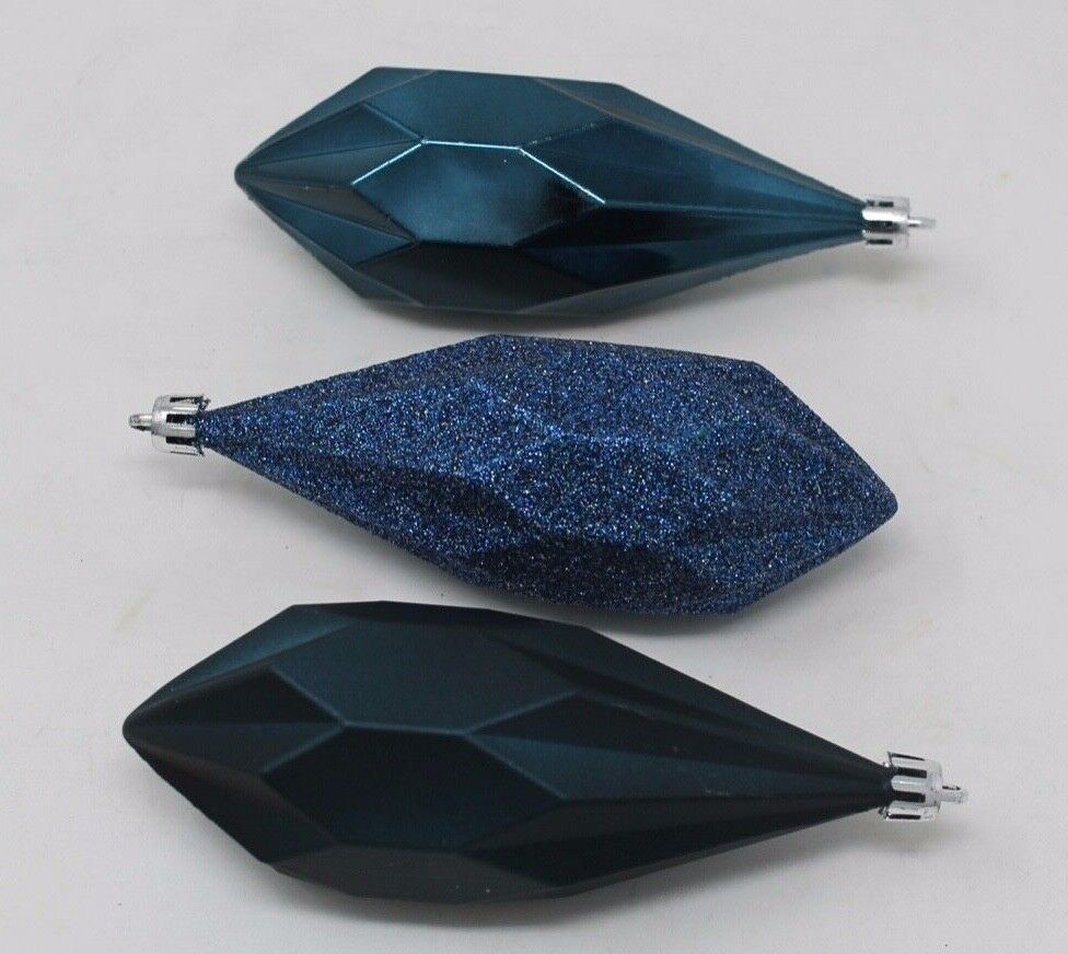 3 x Blue Christmas Baubles Tree Hanging Decoration Ornament Geometric 14cm Tall