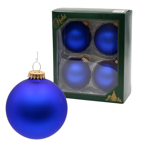 Dekohelden24 Lauschaer Christmas Tree Decorations - Blue Christmas Tree Baubles, Set of 4 Baubles Lauscha Plain Matt Satin Royal Blue, 8 cm, with Golden Crown + 50 Quick Hangers in Gold