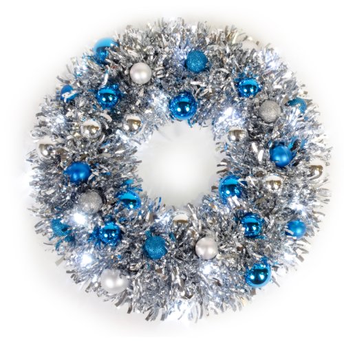 WeRChristmas 36 cm Pre-Lit Tinsel Wreath with Baubles 20-LED Lights Christmas Decoration, Silver/ Blue