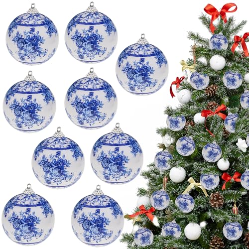 Yatinkim 9 Pcs Blue and White Christmas Baubles Christmas Tree Decorations Baubles Chinoiserie Blue Bauble 7.5cm Plastic Hanging Ball for Xmas Tree Wreath Festival Orb for Home Wedding Party