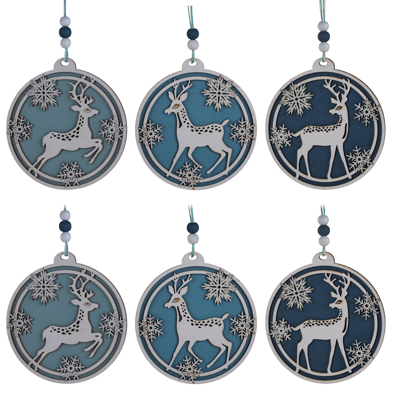 Blue Deer Christmas Baubles Wooden Tree Decorations - Teal & Navy - Set of 6