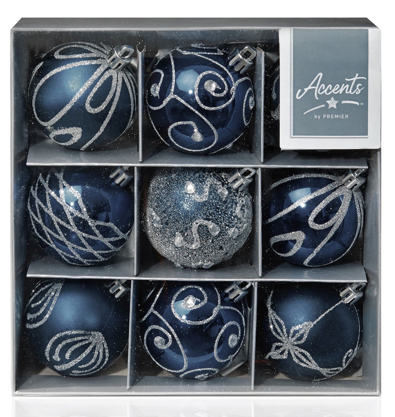 Premier 60mm Midnight Blue Christmas Baubles | 9 Assorted Shatterproof Tree Decorations
