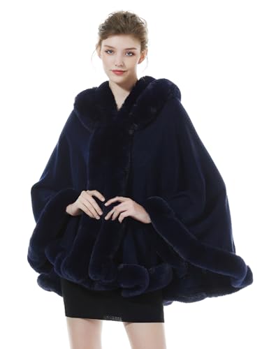 BEAUTELICATE Knit Cape Coat Women Knitted Hooded Cloak Poncho with Fur Collar Faux Fur Shawl Wrap Stole Fashion Oversize Cardigans for Autumn Winter Wedding Bride Bridesmaids(One Size, Navy Blue)