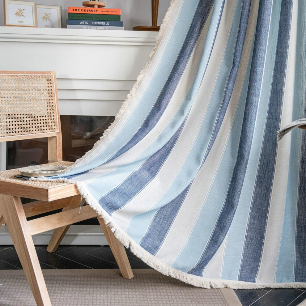 Blue SemiBlackout Bedroom Curtains 2Panel Set Drapes, Cotton Rod Pocket, Striped Design, Beige Tassels, 52 x 84 In