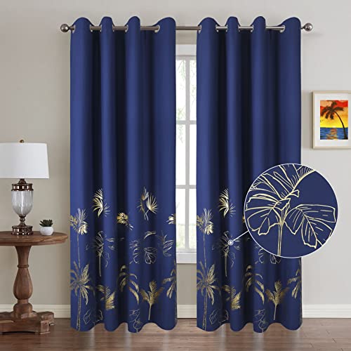 Royal Blue Blackout Curtains for Bedroom Gold Foil Printed Palm Bedroom Living Room Leaves Navy Blue Trees Luxury Tropical Eyelet 66×72 Thermal 100% Total Room Darkening Window Curtain 2 Panels