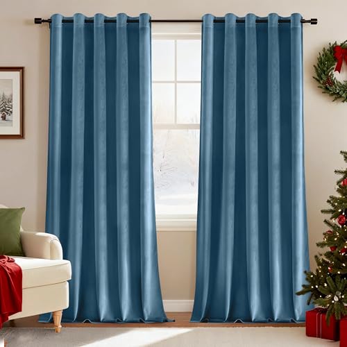 Deconovo Velvet Blue Curtains Eyelet Soft Bedroom Thermal Curtains Insulated Elegent Room Darkening Panels for Living Room 46 x 90 Inch Stone Blue One Pair