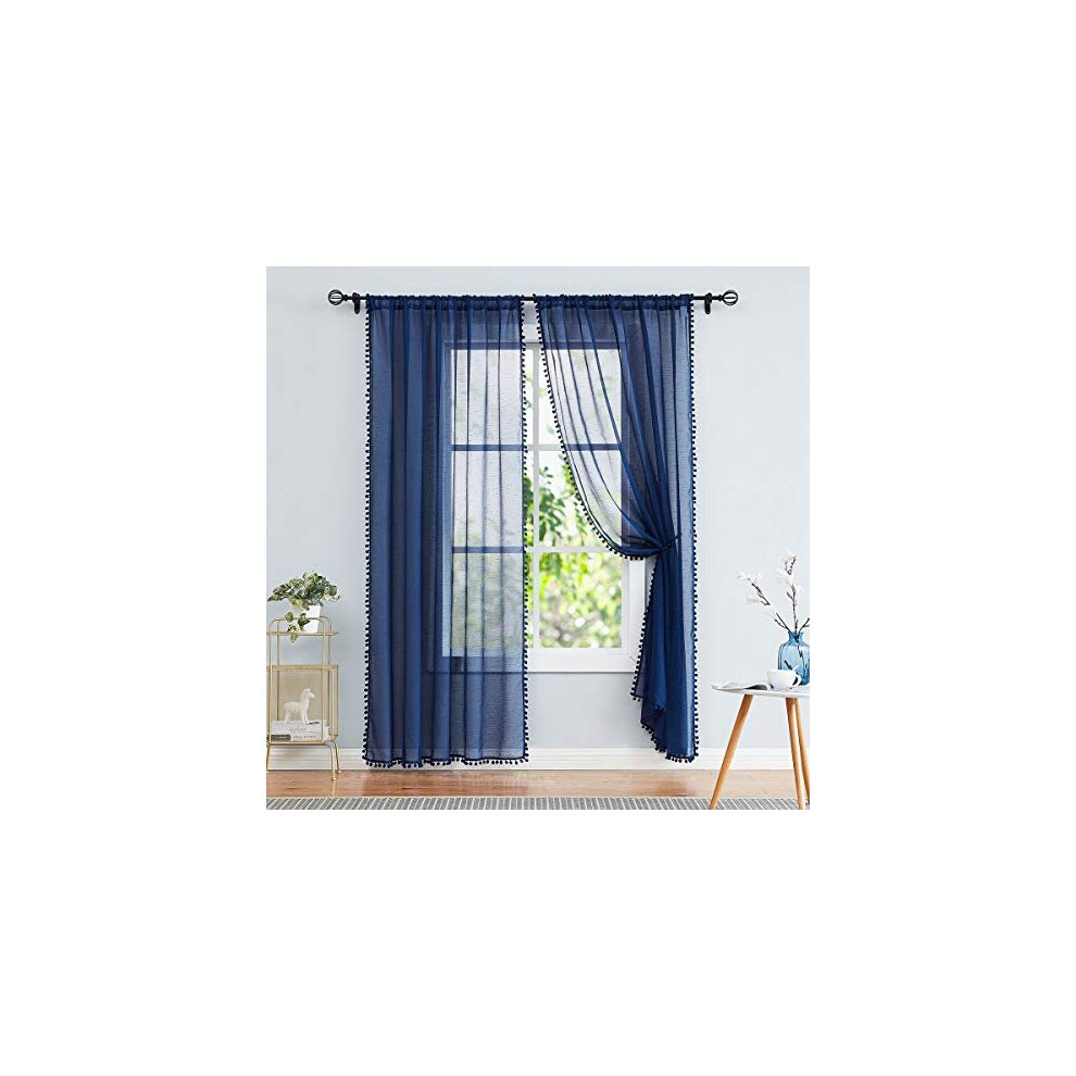 Pom-Pom Navy-Blue Sheer Curtains for Bedroom Windows 84inches Long Linen Textured Look Sheer Drapes for Living Room 52" w x 2Pack