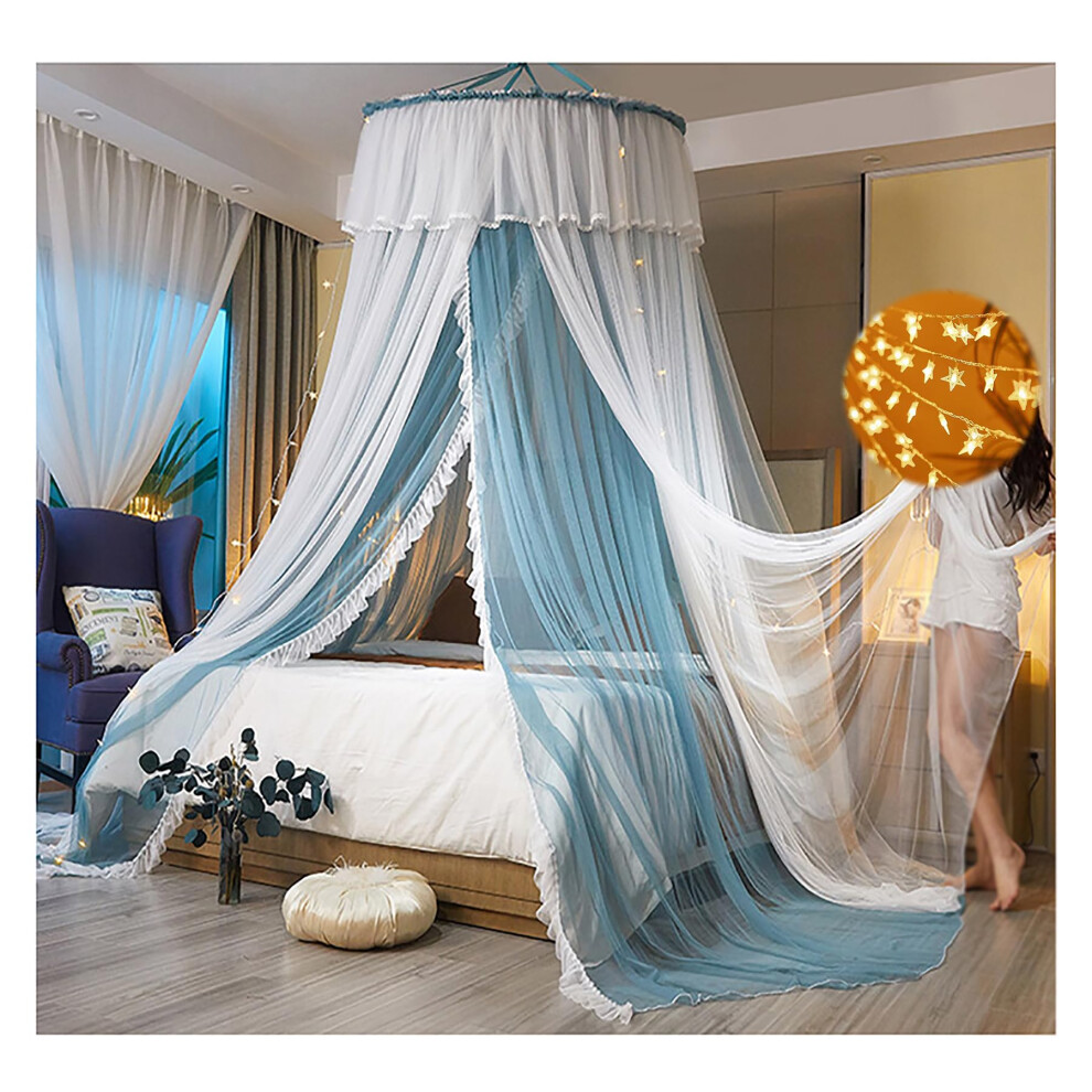 Mosquito Net Bed Canopy With Lights For Princess Bed Netting Double Layer Round Dome Blue Bedroom Curtains