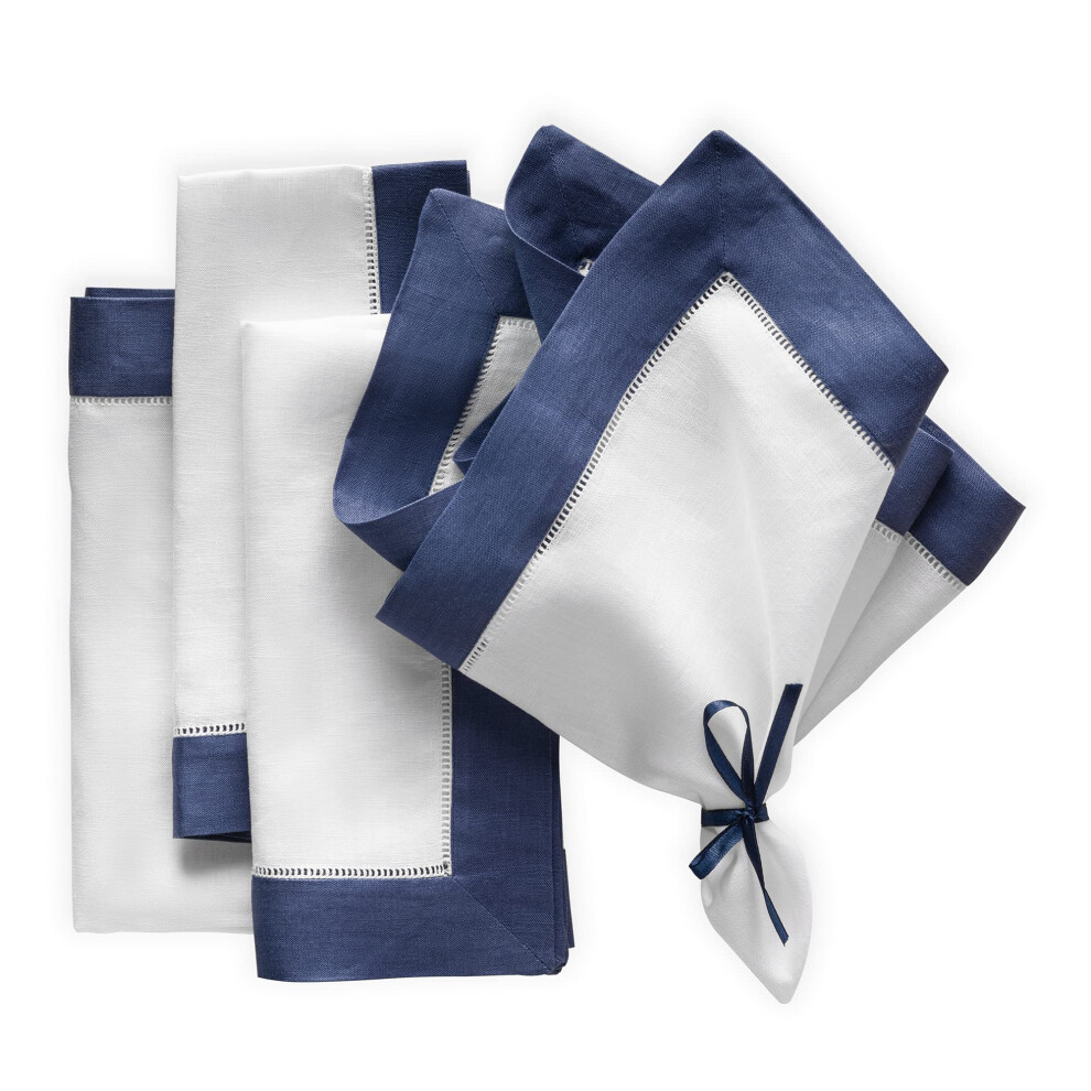 Linen Napkins 20 x 20 inch - 100% Pure Linen White and Navy Blue Dinner Napkins Set of 4 - Hemstitch Napkins Cloth Washable for Christmas Winter Holi