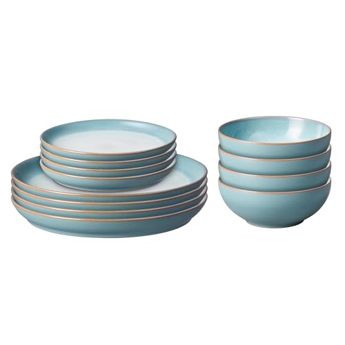 Denby - Azure Blue Dinner Set for 4-12 Piece Ceramic Tableware Set Blue, White - Dishwasher Microwave Safe Ceramic, Stoneware Crockery - Includes 4 x Dinner Plates, Small Plates, Cereal Bowls