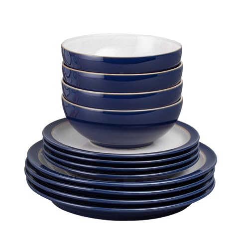 Denby - Elements Dark Blue Dinner Set For 4 - 12 Piece Ceramic Tableware Set - Dishwasher Microwave Safe Crockery Set - 4 x Dinner Plates, 4 x Medium Plates, 4 x Cereal Bowls