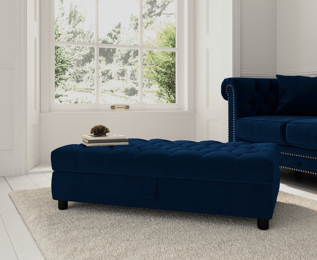 Blue Crushed Velvet Footstool Drawer Wooden Legs Ottoman Padded Trunk Footrest