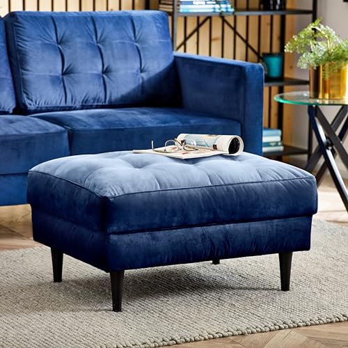 Furniturebox UK Joni Navy Blue Velvet Footstool - Upholstered Modern Dark Blue Fabric Foot Stool with Black Wooden Tapered Legs - Square Stitching - Stylish & Contemporary Living Room Furniture