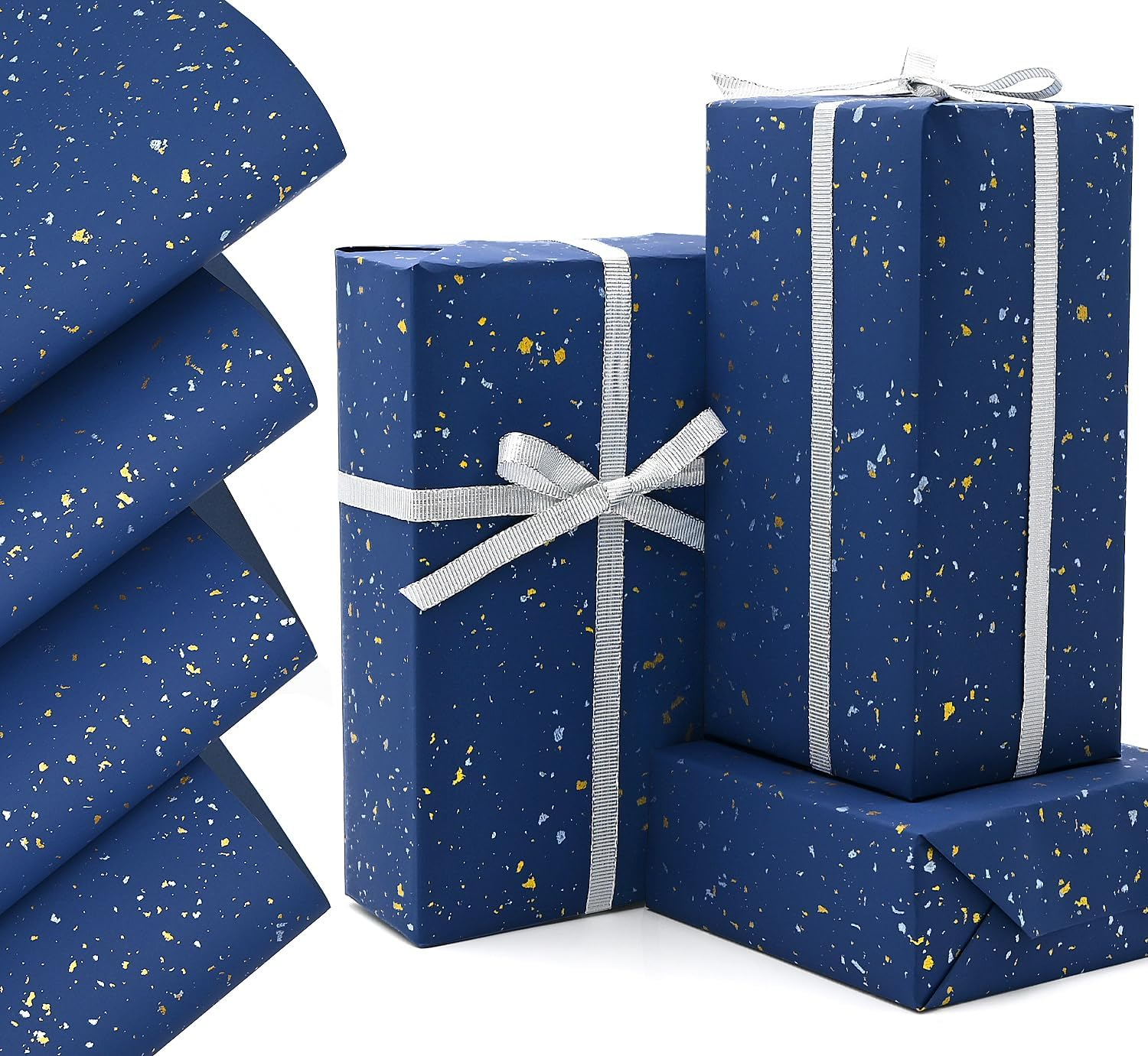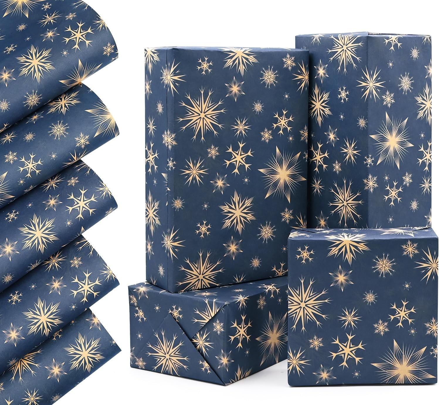 3 Rolls Blue Gold Gift Wrapping Paper, 43Cm*3M Wrapping Paper Print with Star an