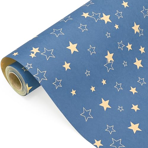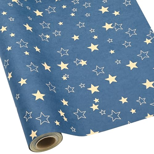 FMDPZUP 43cm*15m Blue Star Wrapping Paper Roll, Blue Xmas Gift Wrap Paper for Packing Present,Eco Birthday Paper