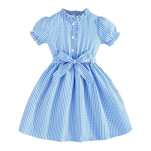 Guoegh Girl School Dress Pleated Gingham Dresses Kids Striped A-line Summer Uniform with Bow(Blue,6-7 Years)