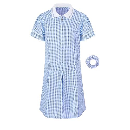 Girl's School Uniform Pleated Gingham Summer Dress + Hair Bobble Age 3 4 5 6 7 8 9 10 11 12 13 14 15 16 17 18 Years Sky Blue