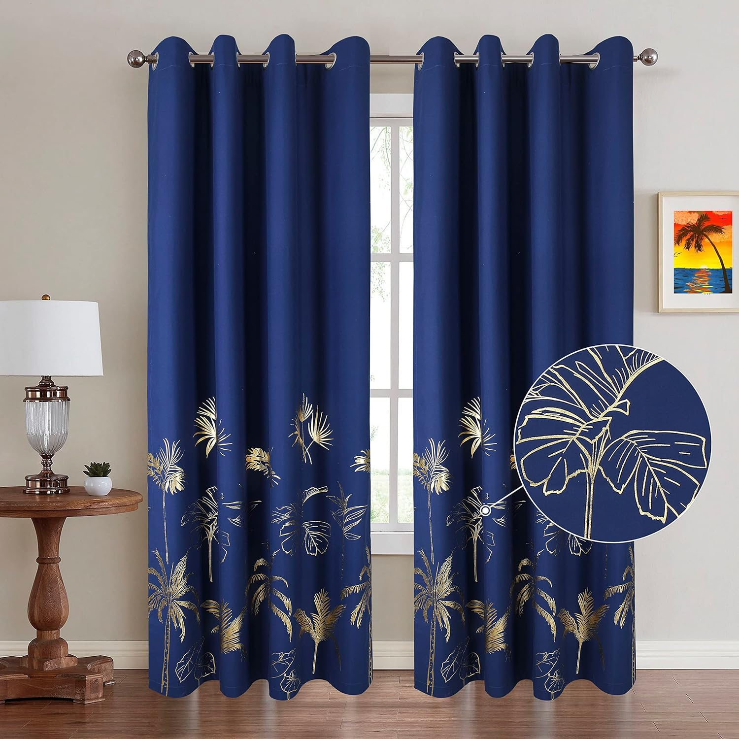 Royal Blue Blackout Curtains for Bedroom Gold Foil Printed Palm Bedroom Living R